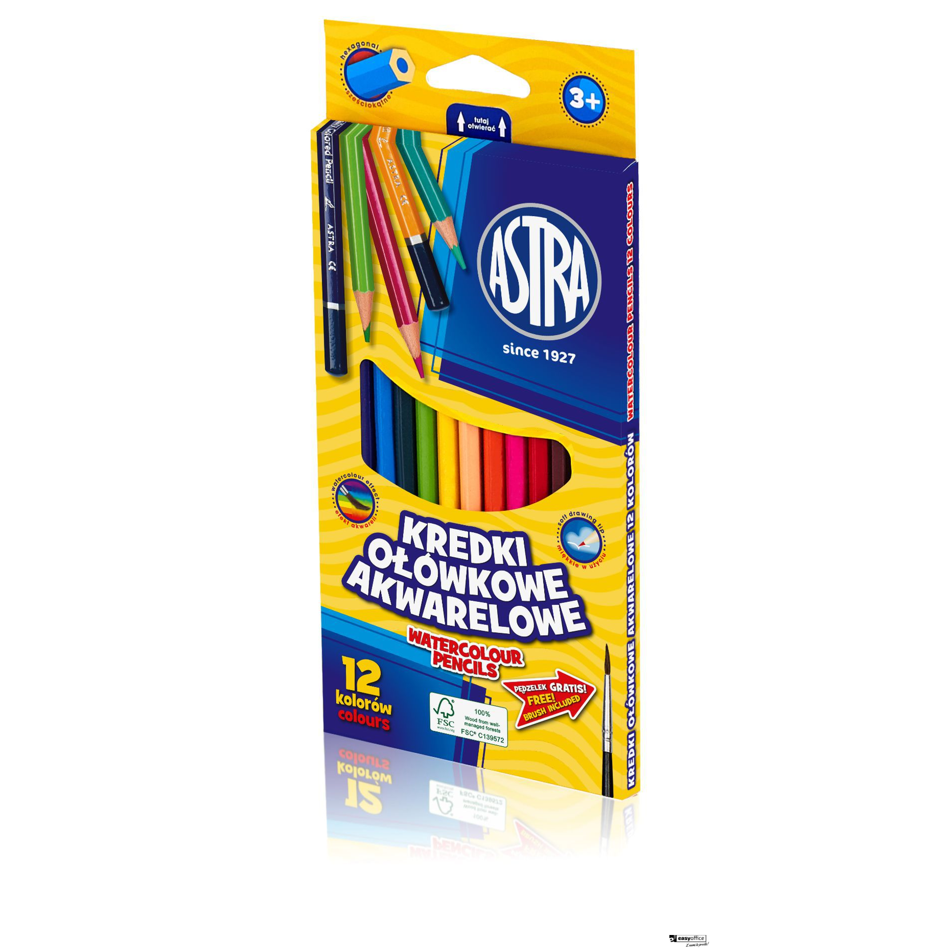 Kredki ołówkowe heksagonalne z czarnego drewna - 12 kolorów z temperówką ASTRA, 312114001