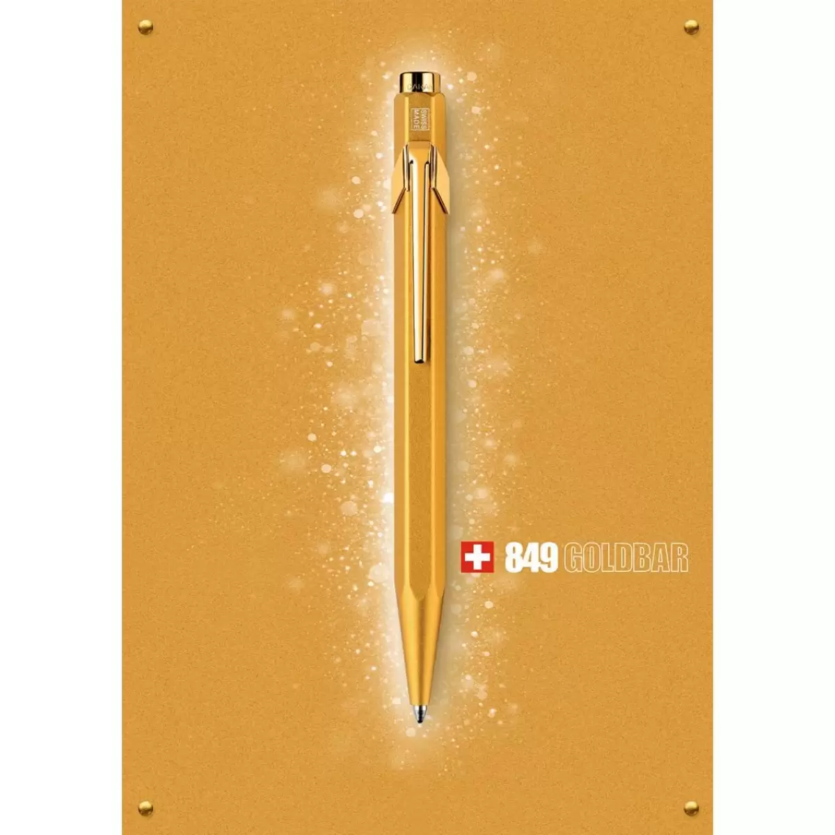 Długopis szwajcarskiej marki Caran d’Ache z kolekcji 849 Goldbar. Aby uzyskać złoty kolor i satynową powierzchnię długopis przechodzi kilka skomplikowanych procesów technologicznych. Jest odzwierciedleniem zmieniających się trendów. Długopis wykonany z aluminium o sześciokątnym przekroju, idealnie dopasowany do dłoni. Posiada przyciskowy mechanizm wysuwu wkładu i bardzo solidny klips. Wyposażony w bardzo pojemny wkład długopisowy Goliath, który pozwoli nam na zapisanie 600 stron A4. Długopis umieszczony jest w specjalnym firmowym pudełku z magnetycznym zamknięciem. Wyprodukowany w Szwajcarii.