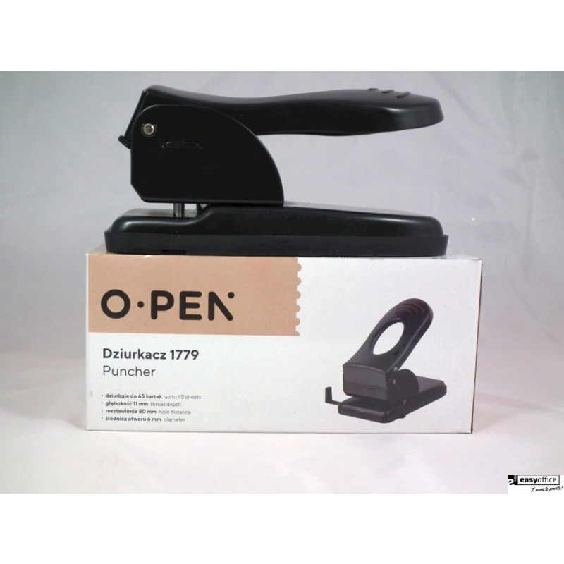 Dziurkacz metalowy z gumową podstawą antypoślizgową. Dziurkuje do 65 kartek. Rozstaw otworów 80mm. Średnica otworu 6mm. Wyposażony w listwę formatową. Pojemnik na ścinki w podstawie. Kolor czarny.