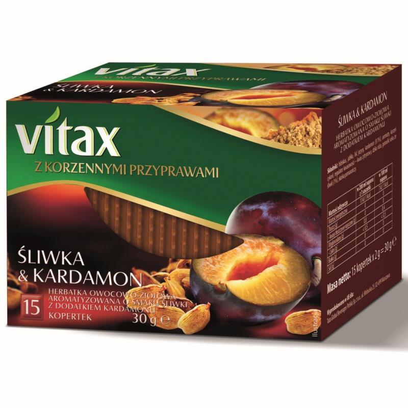 Herbatka owocowo-ziołowa aromatyzowana o smaku śliwki z dodatkiem kardamonu. Vitax z Korzennymi Przyprawami to unikalne kompozycje, których intensywny smak i wyrazisty aromat sprawią, że każda chwila chłodnych, jesienno-zimowych wieczorów wypełni się rozgrzewającą przyjemnością. Sekretem tych starannie dobranych kompozycji są wyjątkowe połączenia owocowych smaków z niezwykle aromatycznymi korzennymi przyprawami. Dojrzała śliwka i ostry smak kardamonu idealnie się uzupełniają. Skosztuj tej wyjątkowej kompozycji, a poczujesz niezwykle aromatyczną korzenną nutę. Tyle przyjemności i tak mało kalorii! Składniki: hibiskus, jabłko, liść jeżyny słodkiej, kardamon (9,1%), aromaty, korzeń cykorii, regulator kwasowości - kwas cytrynowy, dzika róża, skórka pomarańczy, granulki soku ze śliwki (1%). Dwukomorowa torebka herbatki użyta w tej linii pozwala na przenikanie się aromatów w trakcie zaparzania. Pozwala to wydobyć z herbatki wszystko to co najlepsze i cieszyć się jej niezapomnianym smakiem. Zawartość opakowania: 30 g (15 torebek w kopertkach x 2 g).