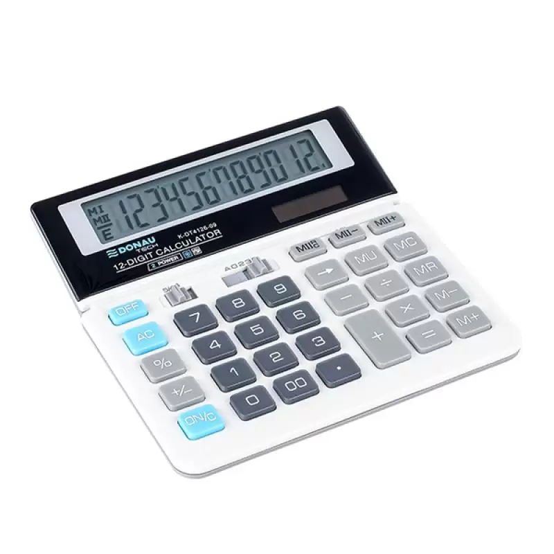 kalkulator biurowy z 12-cyfrowym wyświetlaczem z zasilaniem bateryjno-solarnym wymiary: 156 x 152 x 28 mm funkcja pierwiastka kwadratowego oraz obliczania procentów, obliczanie marży MU podwójne zero, kasowanie ostatniej pozycji, pamięć, ustawienie dziesiętne, zaokrąglanie wyniku, kasowanie ostatniej pozycji wyłącza się automatycznie 5 lat gwarancji kolor: biały