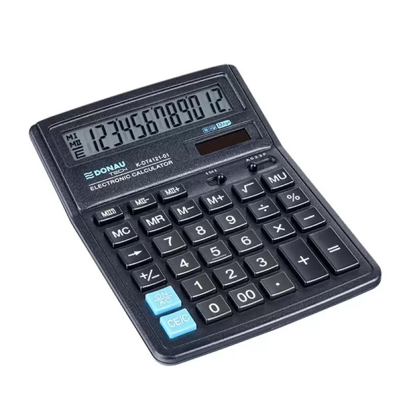 kalkulator biurowy z 12-cyfrowym wyświetlaczem z zasilaniem bateryjno-solarnym wymiary: 199 x 153 x 31 mm funkcja pierwiastka kwadratowego oraz obliczania procentów, obliczanie marży MU, podwójne zero, kasowanie ostatniej pozycji, pamięć, ustawienie dziesiętne, zaokrąglanie wyniku wyłącza się automatycznie 5 lat gwarancji kolor: czarny