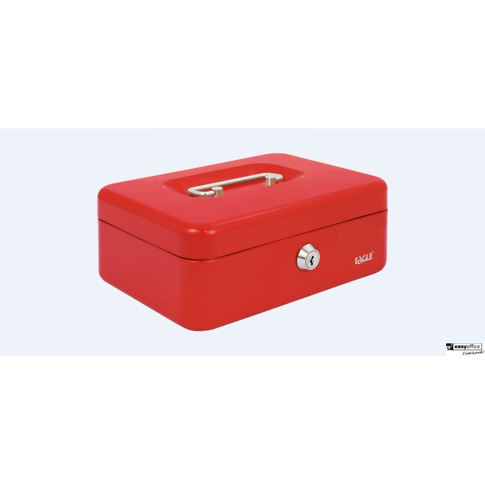 Kasetka na pieniądze Eagle__ wykonana z metalu, zamykana na kluczyk__ posiada plastikowy wkład na bilon__ dostępna w trzech kolorach: czarny, czerwony, niebieski__ jednostka sprzedaży 1 sztuka