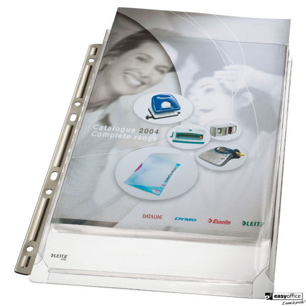 Koszulki Leitz A4 poszerzane z metalową krawędzią_- Z poszerzanym brzegiem do przechowywania katalogów, cenników i grubych ofert - mieszczą do 200 kartek _- Multiperforacja wykonana na metalowej krawędzi, dzięki czemu w koszulce można przechowywać ciężkie pliki i nawet częste przesuwanie ich w segregatorze nie uszkodzi perforacji. _- Wykonane z mocnej folii PVC.