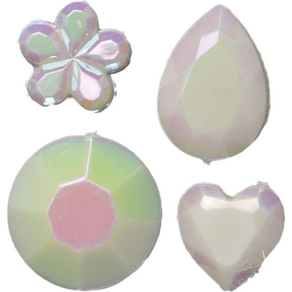 Kryształki samoprzylepne, mix wzorów, rodzaj: kwiaty - średnica 10mm, serca - 10x10mm, krople - 10x14mm, okrągłe - średnica 14mm, kolor perłowy. 35 sztuk.