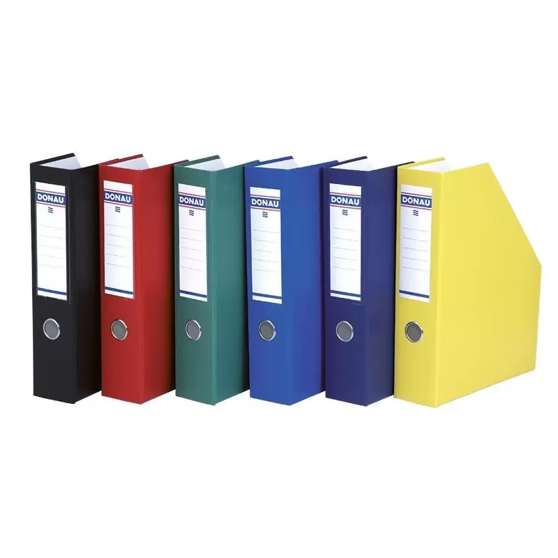 wykonany z tektury o grubości 2,1mm pokrytej ekologiczną folią polipropylenową (100µm) o strukturze płótna posiada Zielony Punkt (Der Grüne Punkt) - udział w systemie recyklingu i odzysku odpadów wynikający z przepisów prawa polskiego i UE okładzina wewnętrzna: biały offset 90-100g szerokość grzbietu: 75mm pojemność: do 750 kartek o gramaturze 80gsm odpowiada jakością segregatorom - po ustawieniu na półce, nie do odróżnienia od klasycznych segregatorów posiada wycięcie na palec do wygodnego wkładania / zdejmowania pojemnika z półki zawiera wymienną etykietę grzbietową składany – bardzo prosty w montażu wymiary: 75x320x245mm kolor czarny