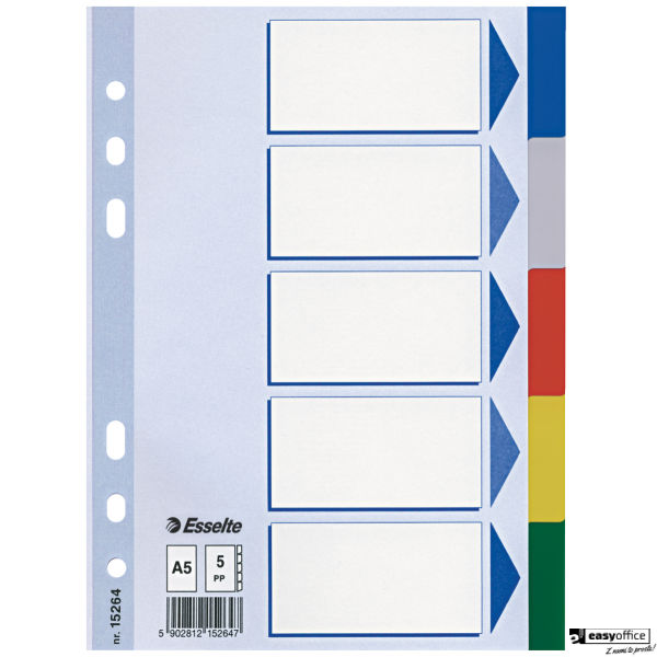 Przekładki plastikowe PP Esselte_- A4 lub A5, a także Maxi (idealne do dokumentów_przechowywanych w koszulkach)_- multiperforowane - pasują do każdego segregatora_- z kartą informacyjno - opisową_- przekładki i indeksy w 5 kolorach_- jednostka sprzedaży 1 komplet