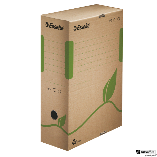 Wykonane w 100% z kartonu z odzysku; z 85% udziałem surowców pochodzących z odpadów konsumpcyjnych. Rozmiar pudeł zoptymalizowany do dokumentów A4. W naturalnym brązowym kolorze, bez użycia wybielaczy. W 100% do ponownego przetworzenia; posiadają certyfikat FSC. Nadruk wykonany przy użyciu ekologicznych farb bazujących na wodzie. Grzbiet 80 mm.
