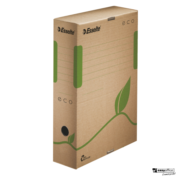 Wykonane w 100% z kartonu z odzysku; z 85% udziałem surowców pochodzących z odpadów konsumpcyjnych. Rozmiar pudeł zoptymalizowany do dokumentów A4. W naturalnym brązowym kolorze, bez użycia wybielaczy. W 100% do ponownego przetworzenia; posiadają certyfikat FSC. Nadruk wykonany przy użyciu ekologicznych farb bazujących na wodzie. Grzbiet 80 mm.