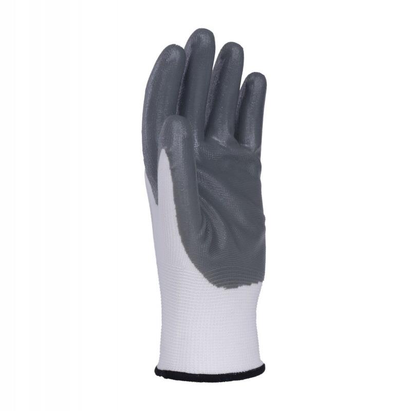 rękawice wykonane z dobrej jakości dzianiny poliestrowej w kolorze białym, powleczone w części chwytnej szarym nitrylem przeznaczone do prac montażowych, magazynowych, mechanicznych, serwisowych, transportowych, budowlanych, remontowych, przemysłowych, rolniczych, ogrodowych oraz zajęć hobbistycznych powłoka z szarego nitrylu o wysokiej odporności na ścieranie przeznaczone do pracy w środowisku suchym i zaolejonym zakończone elastycznym ściągaczem rękawice ochronne chroniące przed uszkodzeniami mechanicznymi kat: II zgodność z normami EN 388:2016+A1:2018 (4131X), EN ISO 21420:2020 ścieg: 13g materiały: poliester/nitryl rozmiar: 10 kolor: biało-szare
