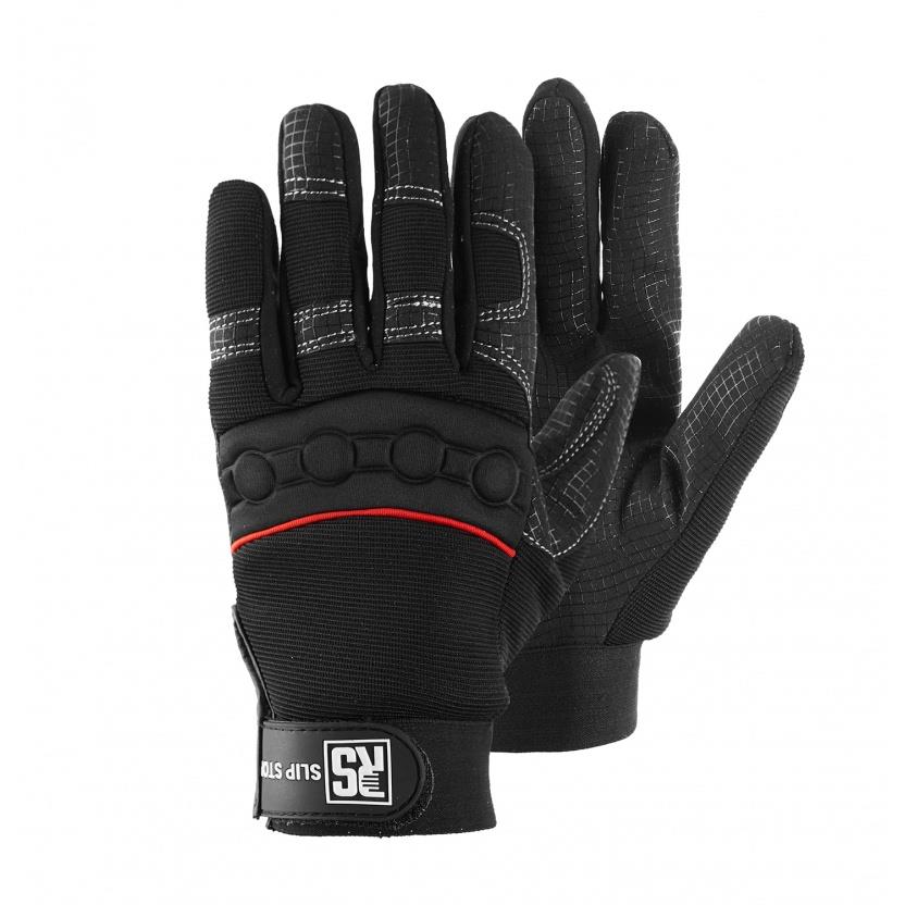 RS SLIP STOP to rękawica ochronna monterska typu mechanics zakończona rzepem niezawodna ochrona przy pracach lekkich, precyzyjnych, a także przy aktywnościach sportowych i rekreacyjnych sztuczna skóra na spodzie dłoni pokryta jest siatką silikonową przez co rękawice dają bardzo pewny chwyt wierzch rękawicy - tkanina poliestrowa EN 420:2003+A1:2009 rozmiar: 10 kolor: czarny