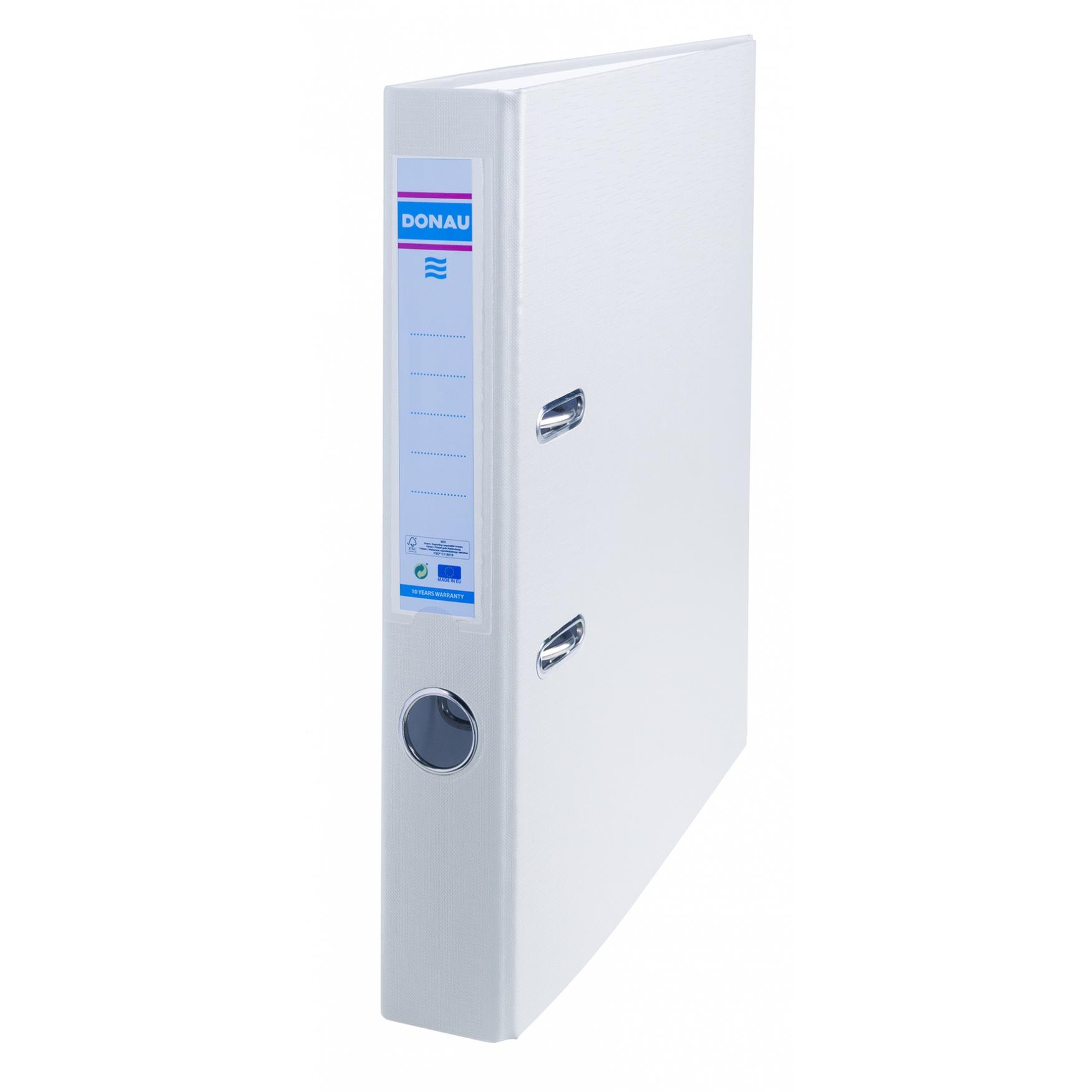 popularny segregator wykonany z tektury o grubości 2,1mm i gramaturze 1290gsm posiada Zielony Punkt (Der Grüne Punkt) - udział w systemie recyklingu i odzysku odpadów wynikający z przepisów prawa polskiego i UE certyfikat FSC® gwarantuje, że surowiec potrzebny do produkcji wyrobu pochodzi z lasów zarządzanych w odpowiedzialny sposób; promuje on trwałą gospodarkę leśną opartą o najwyższe światowe standardy w dziedzinie ochrony przyrody i gwarantuje legalność pochodzenia surowca pokryty ekologiczną folią polipropylenową (100µm) o strukturze płótna wewnątrz biała wyklejka papierowa dźwignia wysokiej jakości z dociskaczem wymienna, obustronna etykieta grzbietowa wzmocniony otwór na palec pod mechanizmem dźwigniowym umieszczony jest numer kontrolny szerokość grzbietu: 50mm wymiary: 50x320x285mm 2 lata gwarancji na mechanizm kolor biały