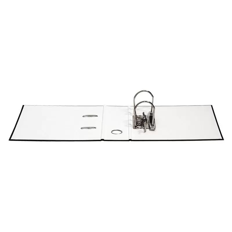 wykonany z tektury o grubości 2,1mm i gramaturze 1290gsm posiada Zielony Punkt (Der Grüne Punkt) - udział w systemie recyklingu i odzysku odpadów wynikający z przepisów prawa polskiego i UE pokryty ekologiczną folią PP (100µm) o strukturze płótna wewnątrz biała wyklejka papierowa dźwignia wysokiej jakości z dociskaczem wymienna, obustronna etykieta grzbietowa metalowa dźwignia, mechanizm i otwór na palec niklowane otwory w okładce na mechanizm dociskowy oraz otwór na palec wzmocnione metalowym okuciem pod mechanizmem dźwigniowym umieszczony jest numer kontrolny szerokość grzbietu: 75mm wymiary: 75x235x225mm 2 lata gwarancji na mechanizm kolor czarny