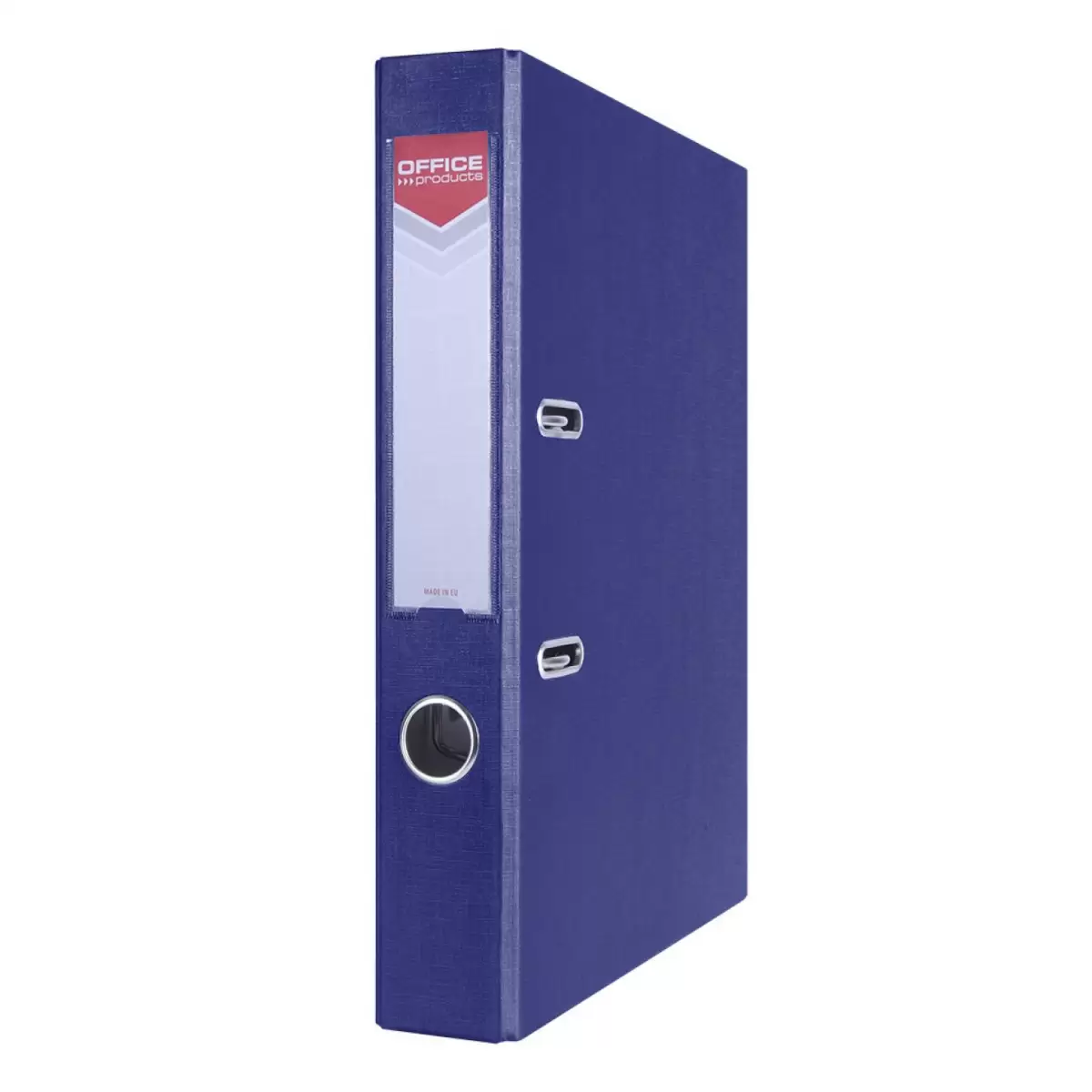 ekonomiczny segregator wykonany z kartonu o grubości 1,9mm i gramaturze 1170gsm pokryty matową folią polipropylenową (100µm) o strukturze płótna wewnątrz wyklejka papierowa o szarym zabarwieniu odporna na zabrudzenia dwustronna, wymienna etykieta grzbietowa w kratkę wzmocniony otwór na palec szerokość grzbietu: 55mm wymiary: 55x320x285mm 5 lat gwarancji na mechanizm kolor granatowy