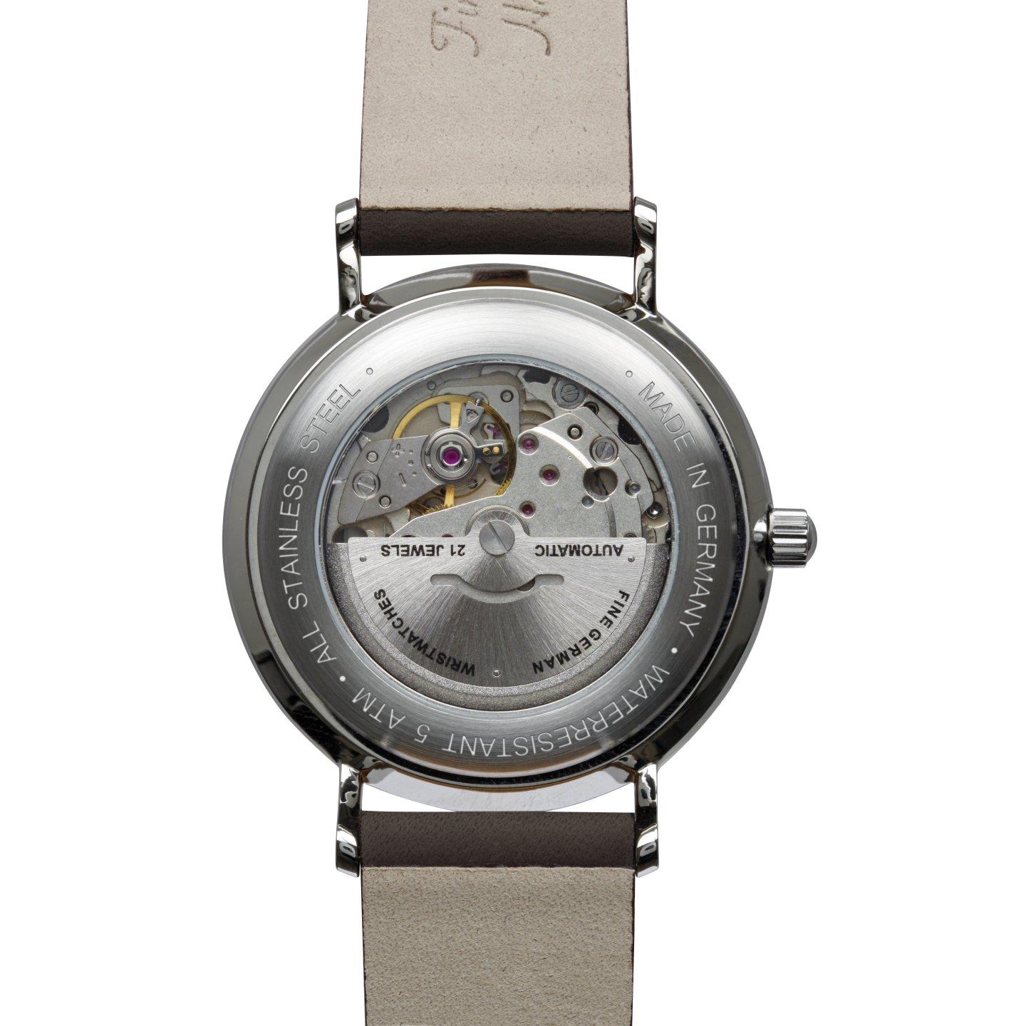 Miyota 8285, koperta ze stali nierdzewnej, utwardzane szkło mineralne K1, tarcza biała, średnica 41 mm, wysokość 13 mm, waga 65 g, WR 5 ATM, pasek skórzany