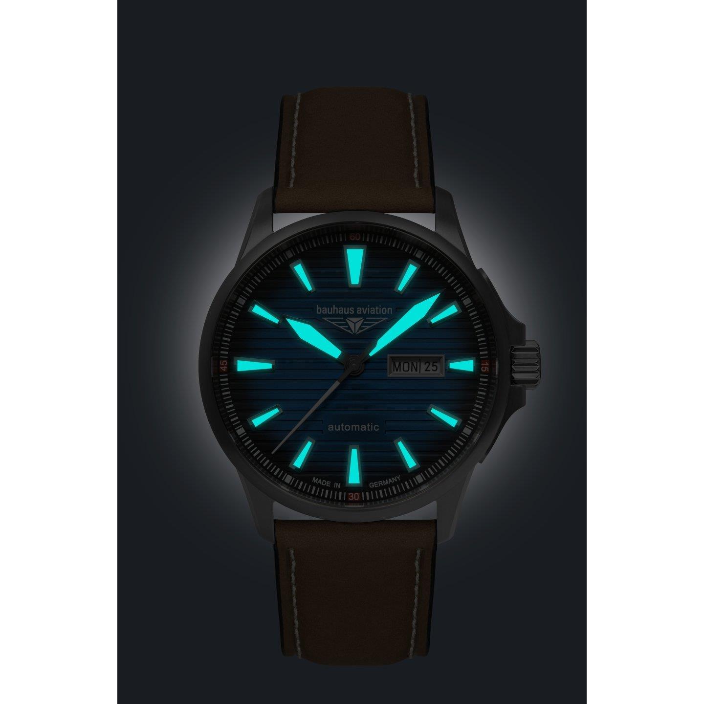 Miyota 8205, tarcza niebieska, indeksy i wskazówki z Super-LumiNova, koperta tytanowa, średnica 42 mm, wysokosć 13 mm, szkło szafirowe, dekiel ze szkłem mineralnym, WR 5 ATM, pasek skórzany 22mm