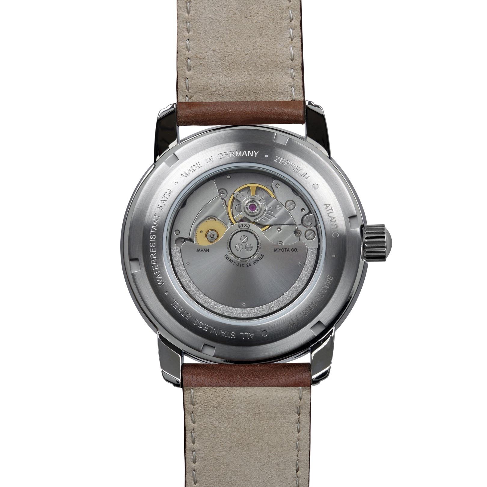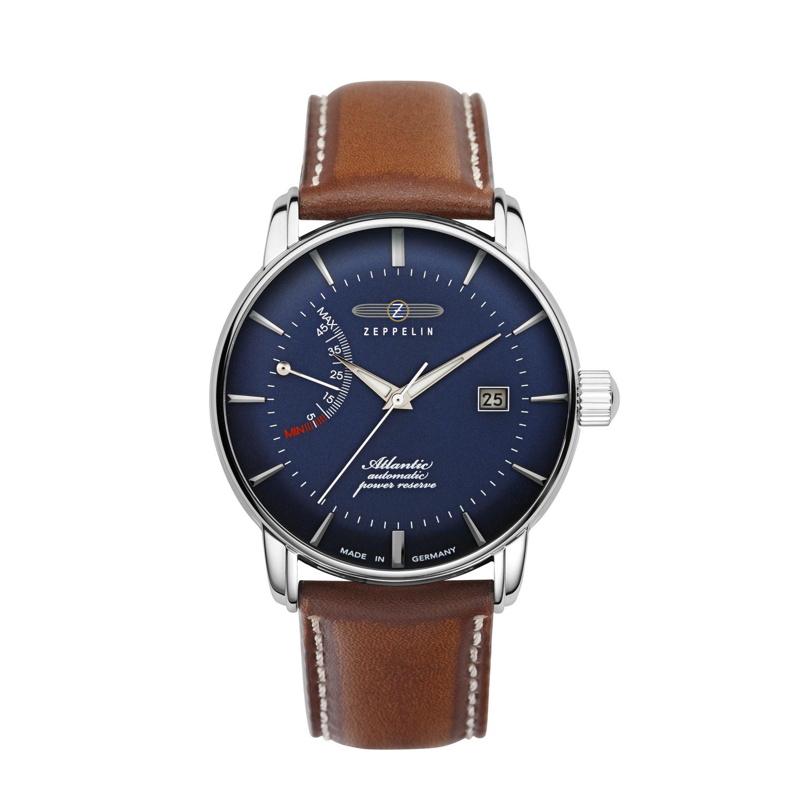 Miyota 9133, szkło mineralne K1, dekiel ze szkłem mineralnym, wskaźnik rezerwy chodu, kopera ze stali nierdzewnej, tarcza granatowa, wskazówki srebrne, paser skórzany brązowy, średnica 42 mm, wysokość 14 mm, masa ok 85 g, WR 5 ATM