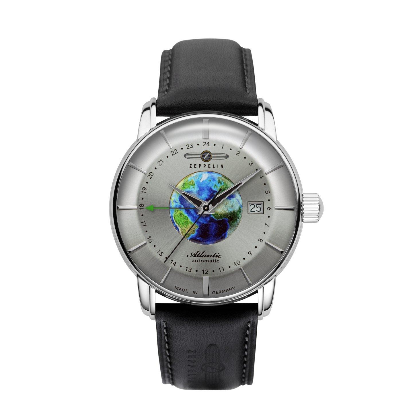 Miyota 9075, tarcza granatowa z globusem, średnica 43 mm, szkło mineralne K1, koperta stalowa, dekiel stalowy, wskazówka GMT, WR 5 ATM, pasek skórzany