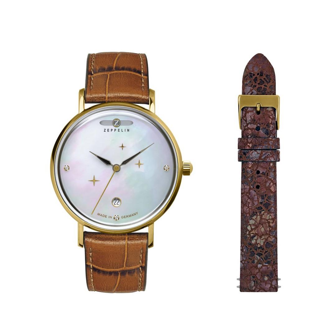 Ronda 505, średnica 36 mm, szkło mineralne K1, tarcza perłowa z trzema kryształkami Swarovskiego i trzema złotymi gwiazdami, dekiel stalowy, wysokość 10 mm, pasek skórzany, WR 5 ATM