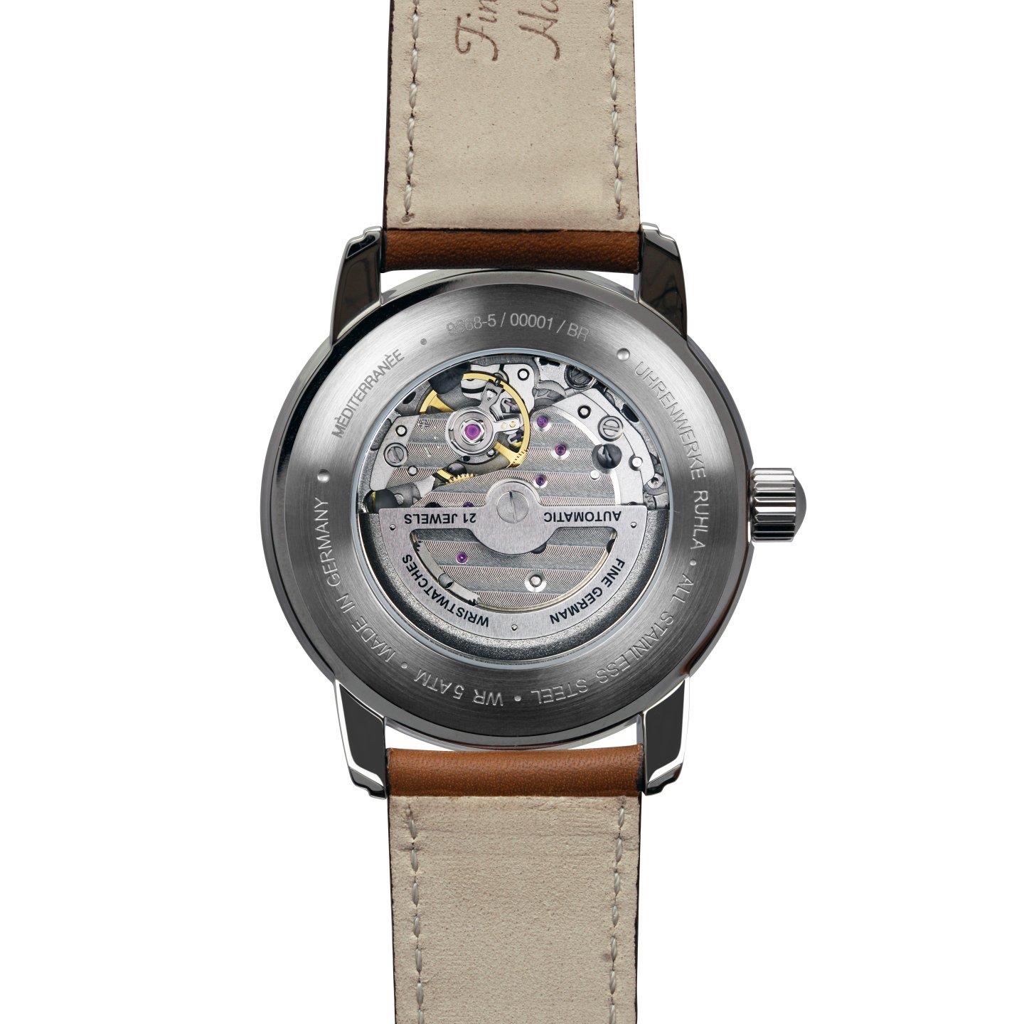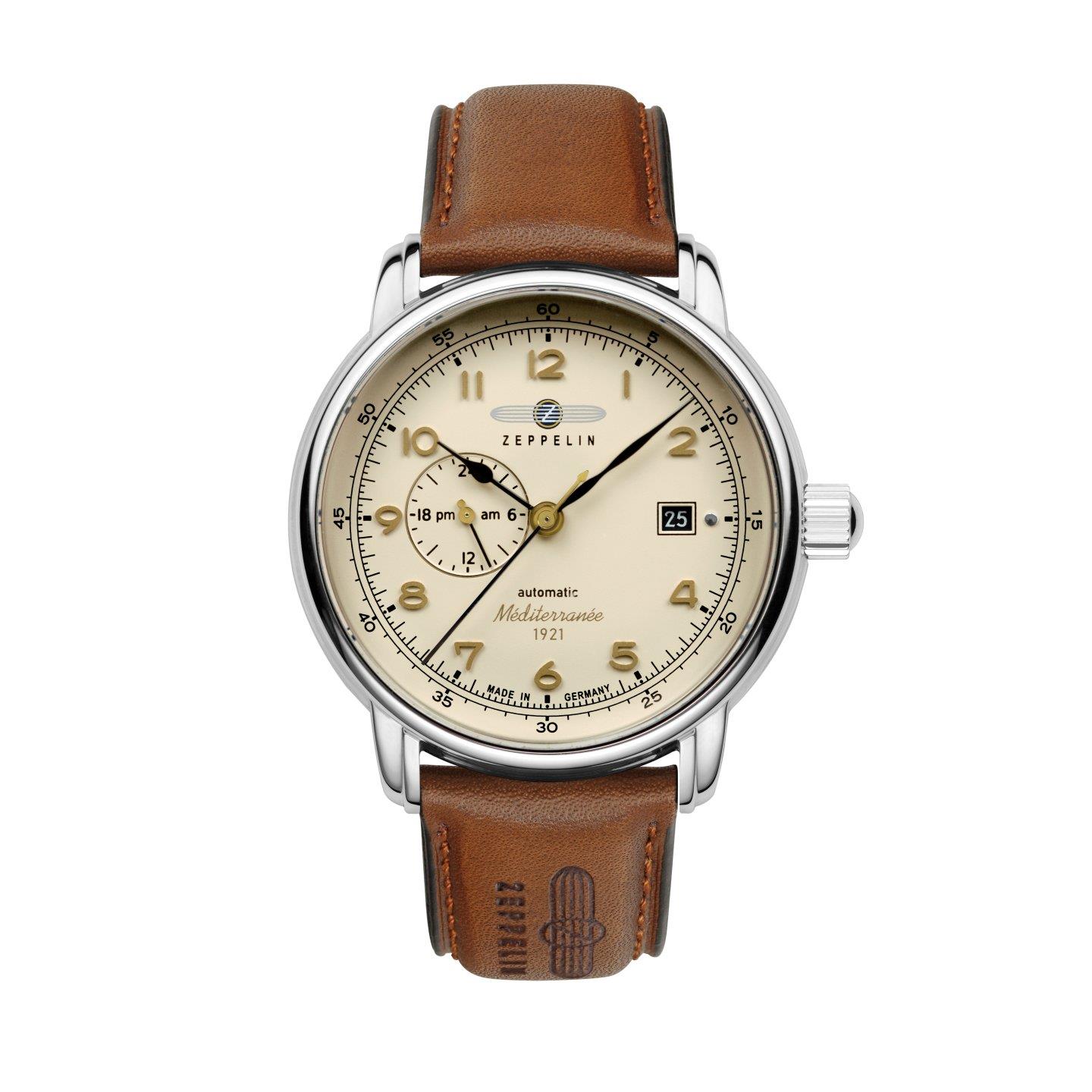 Miyota 8217, tarcza beżowa-szampańska 40 mm, szkło mineralne K1, dekiel ze szkłem mineralnym, wysokość 12 mm, WR 5 ATM, pasek skórzany 20 mm