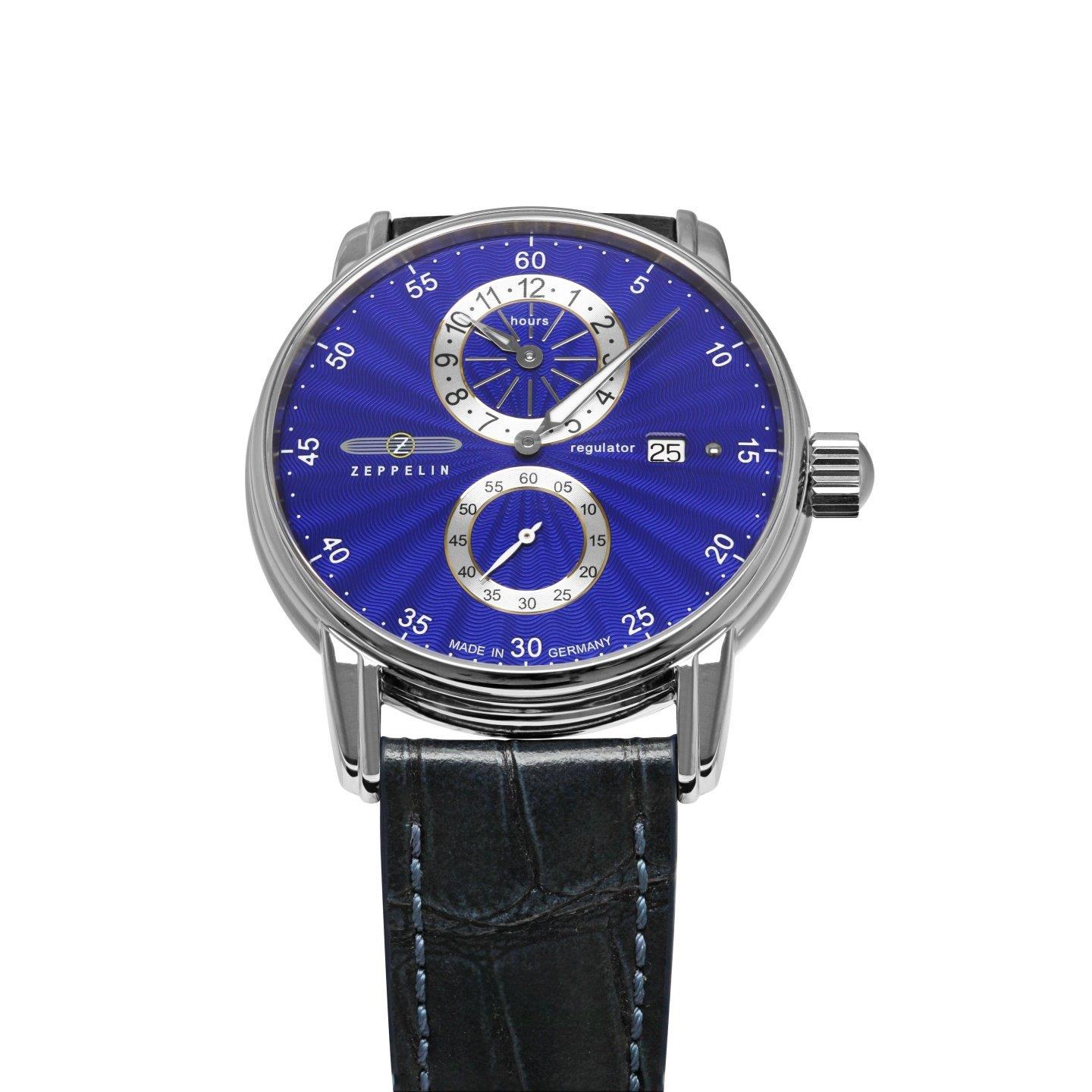 Sellita SW266, tarcza niebieska 42 mm z regulatorem, szkło szafirowe, dekiel ze szkłem mineralnym, koperta stalowa, pasek skórzany 22mm, wysokość 12 mm, WR 5 ATM