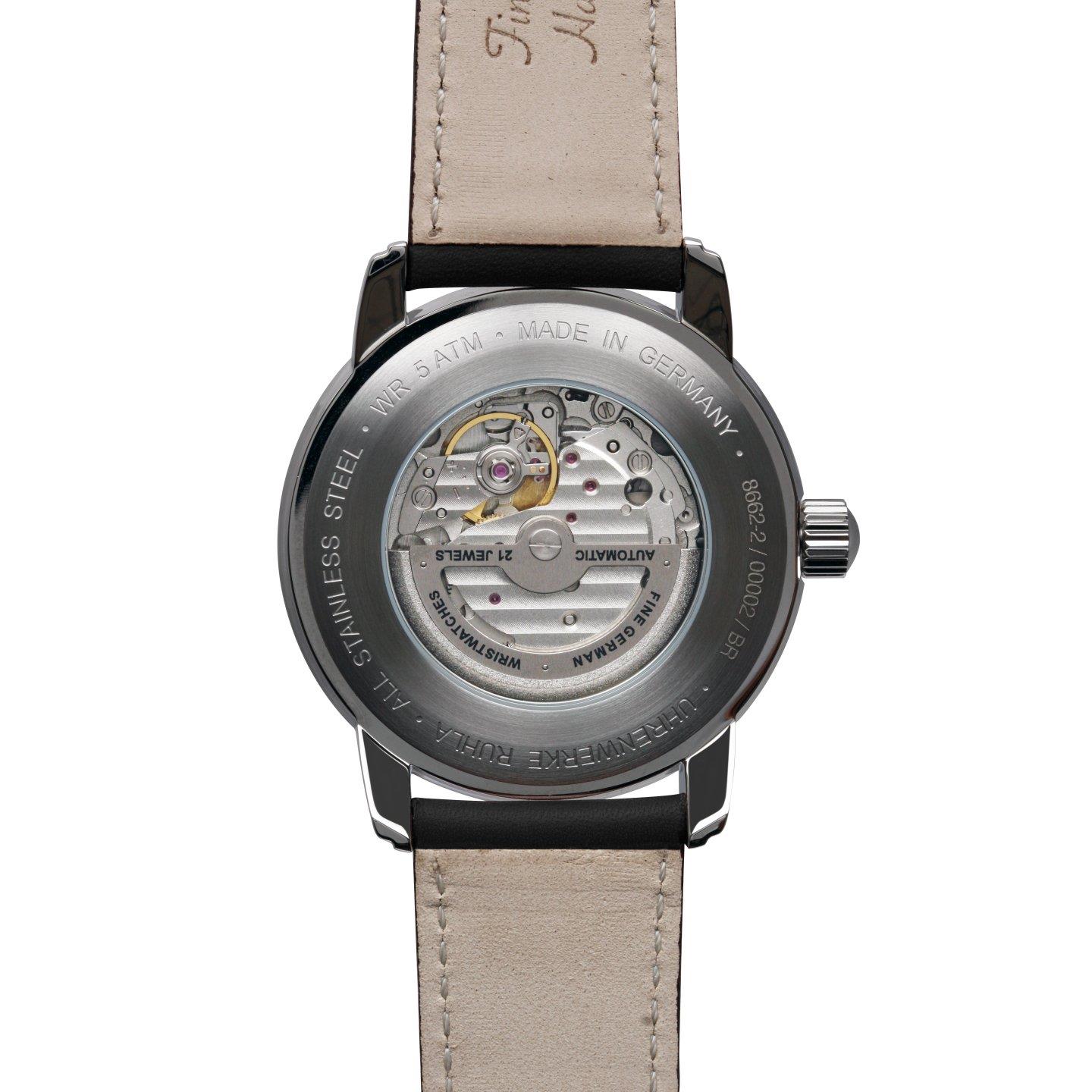 Miyota 82S7, tarcza czarna 43 mm, szkło mineralne K1, dekiel ze szkłem mineralnym, wysokość 13 mm, waga 78 g, WR 5 ATM, pasek skórzany