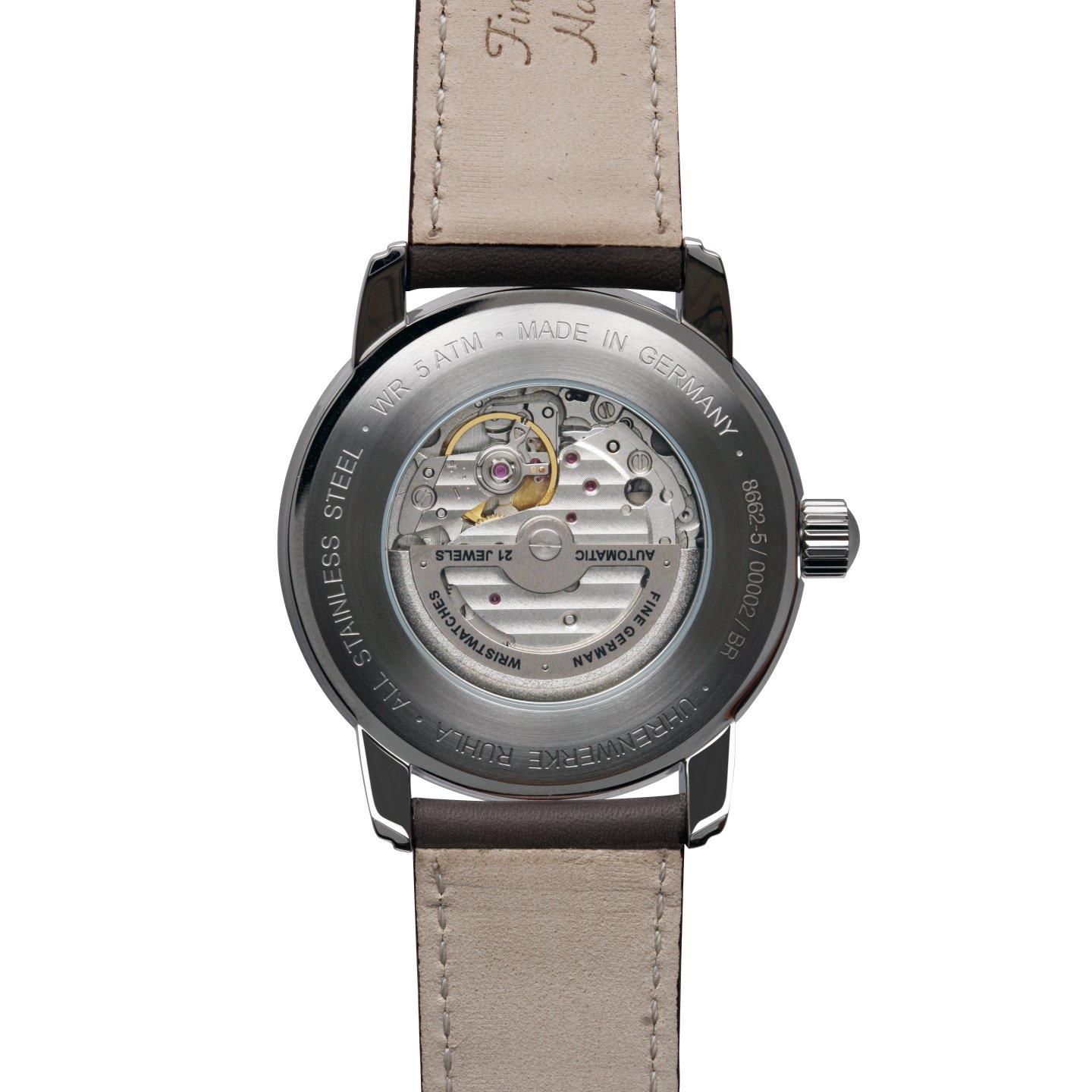Miyota 82S7, tarcza beżowa 43 mm, szkło mineralne K1, dekiel ze szkłem mineralnym, wysokość 13 mm, waga 78 g, WR 5 ATM, pasek skórzany