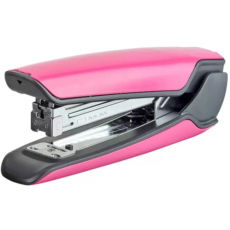 metalowy ergonomiczny korpus, mechanizm oraz podstawa o długości 144 mm zszywanie: otwarte, zamknięte oraz tapicerskie wbudowany rozszywacz z uchwytem na zszywki wskaźnik zużycia zszywek zszywki: 24/6 lub 26/6 pojemność: 100 lub 150 zszywek zszywa: do 30 kartek głębokość wsunięcia kartki: 70 mm 10 lat gwarancji na ramieniu nadrukowana nazwa i logo producenta, na podstawie nadrukowana nazwa i logo producenta, model oraz rozmiar zszywek kolor: różowy